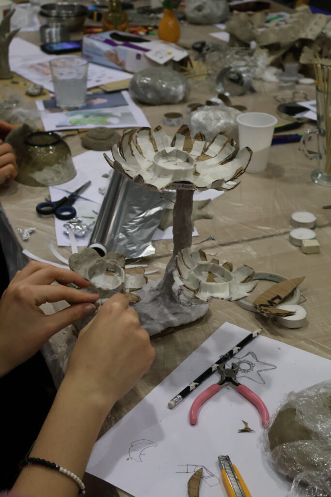 Podczas pierwszego spotkania uczestnicy i uczestniczki samodzielnie przygotowali masę papierową – poznając jej właściwości oraz proces powstawania, a następnie przystąpili do formowania lampionów, świeczników i innych autorskich form inspirowanych motywem światła i ciepła. Po tygodniowym suszeniu prac odbyło się drugie spotkanie, w trakcie którego powstałe obiekty zostały dopracowane i udekorowane.